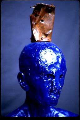 Blue Man With Can (detail) clay, rusty can, paint