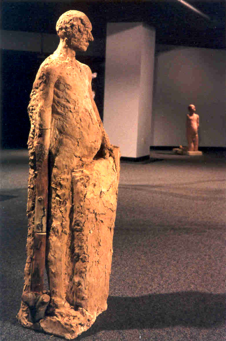 Man Supported by Treetrunk clay, wood, railroad spike